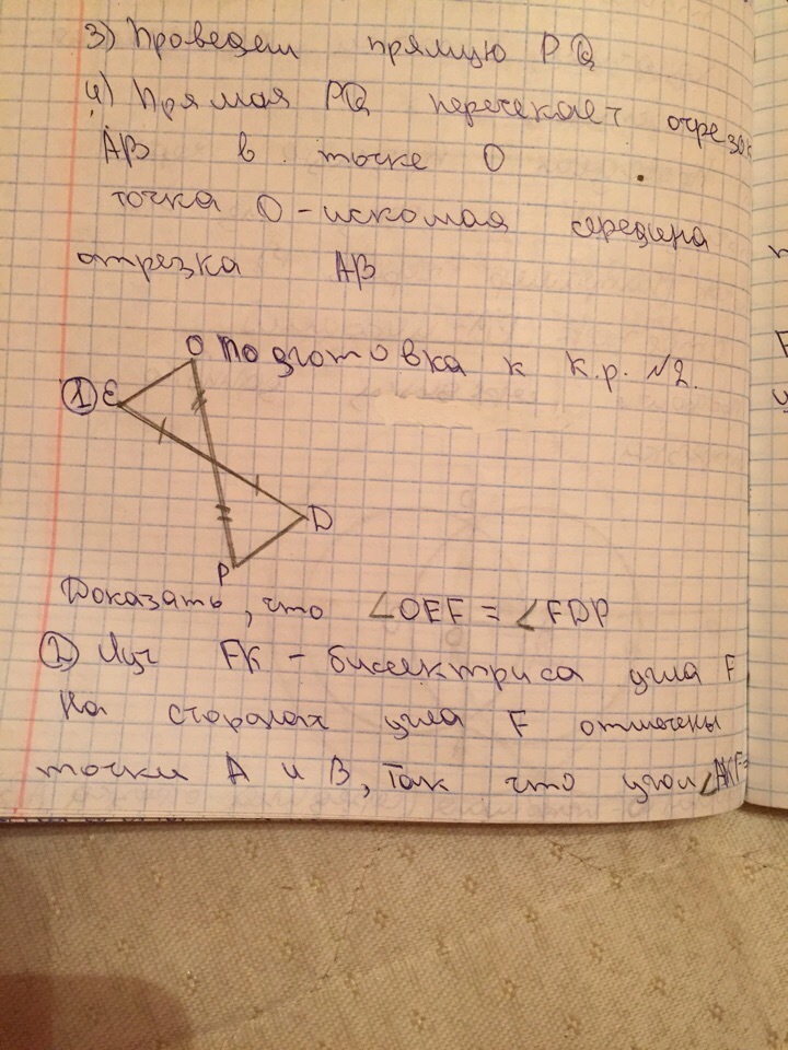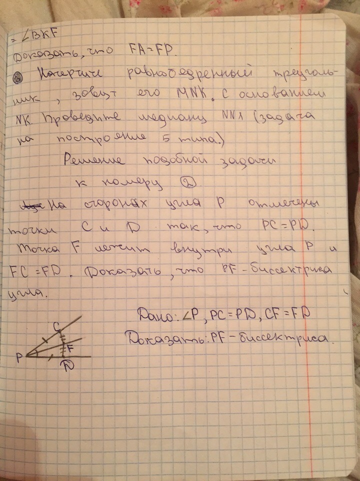 1. Треугольники равны по признаку 3х сторон. Опустим перпендикуляры FM и FN на стороны РС и РD. Они являются высотами соответственных углов ( при F) равных тр-ков, следовательно FM=FN, то есть F равно удалена от PC и PD, PF прямая, значит все ее точки тоже равно удалены, а по определению биссектриса есть ГМТ равноудаленных от сторон, следовательно PF -биссектриса, чтд