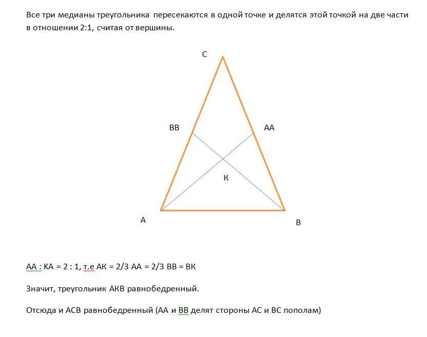 да, Вы правы. надо опустить медиану из угла С на АВ в точку СС. В треуг АКВ она же будет и высота, т.к он равнобедренный. но тогда и медиана С СС будет высотой в треуг АВС. т.е. АВС - равнобедренный.