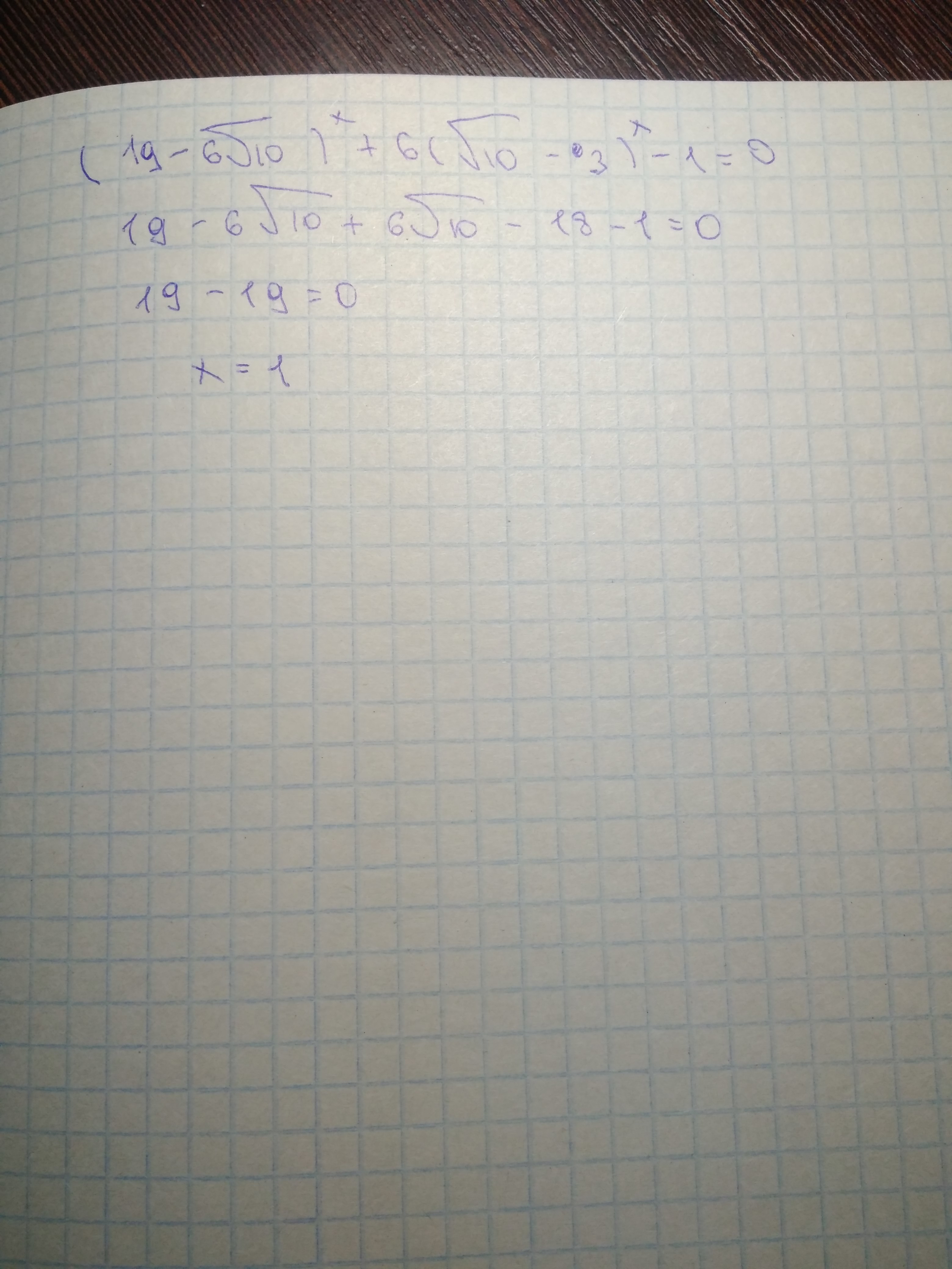 Ответ: (19-6корень из 10)+6(корень из 10-3)-1=0. Раскрываем скобки : 19-6 корень из 10 +6 корень из 10 - 18-1=0 Корни сокращаются, т.к с противоположными знаками и остается 19-19=0. И х=1 так как только в 1-ой степени получится 0