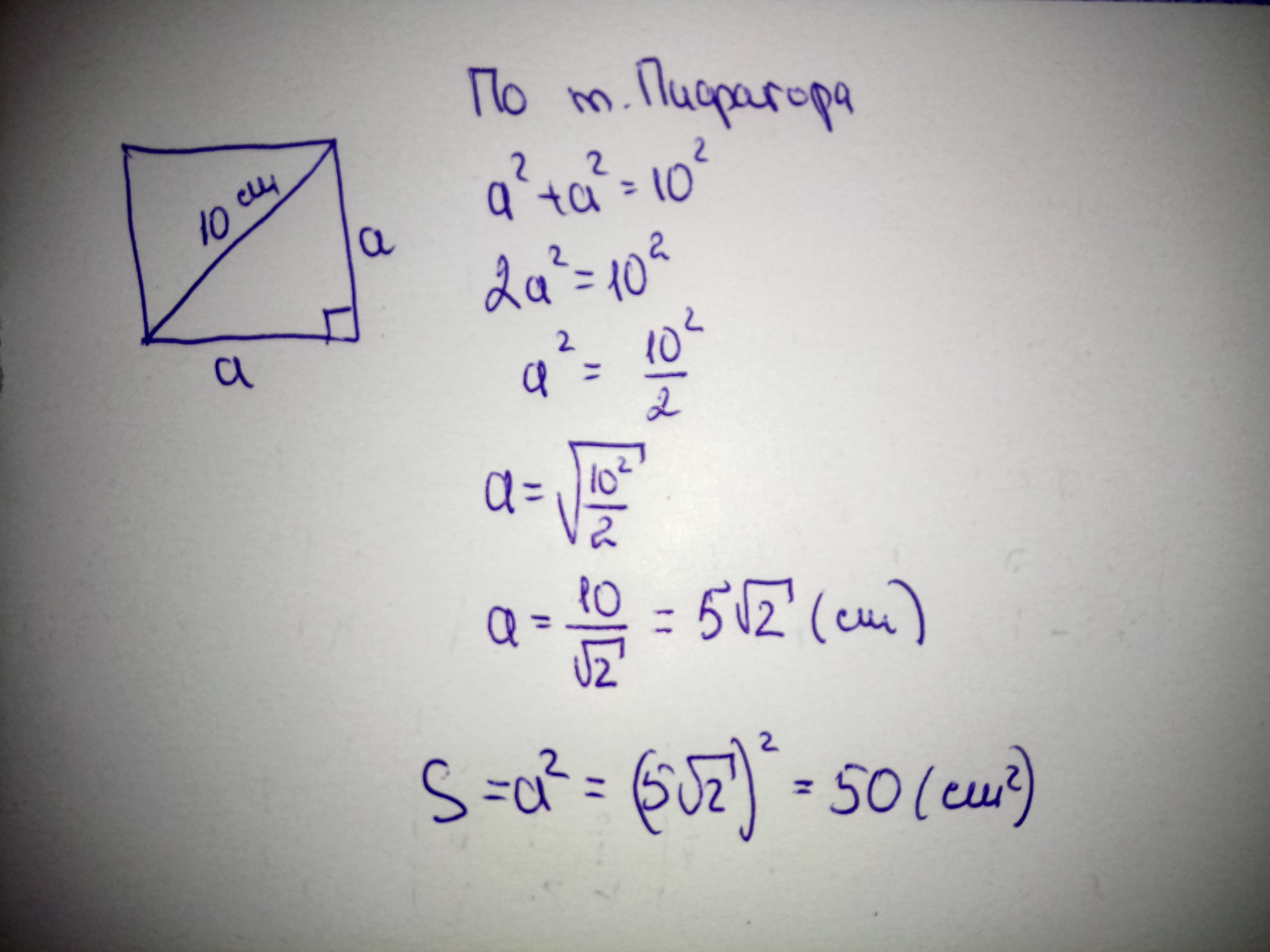 Тогда в учебнике такой задачи не будет. Это задачи из разделов 8 и 9 классов. В сборниках для ГИА и ЕГЕ они тоже есть, тогда решать не важно как, лишь бы решить (тест). Если к моменту изучения площади многоугольника по геометрии, по алгебре пройдены корни квадратные, то уже ученик может использовать формулу а=d/ |/2.