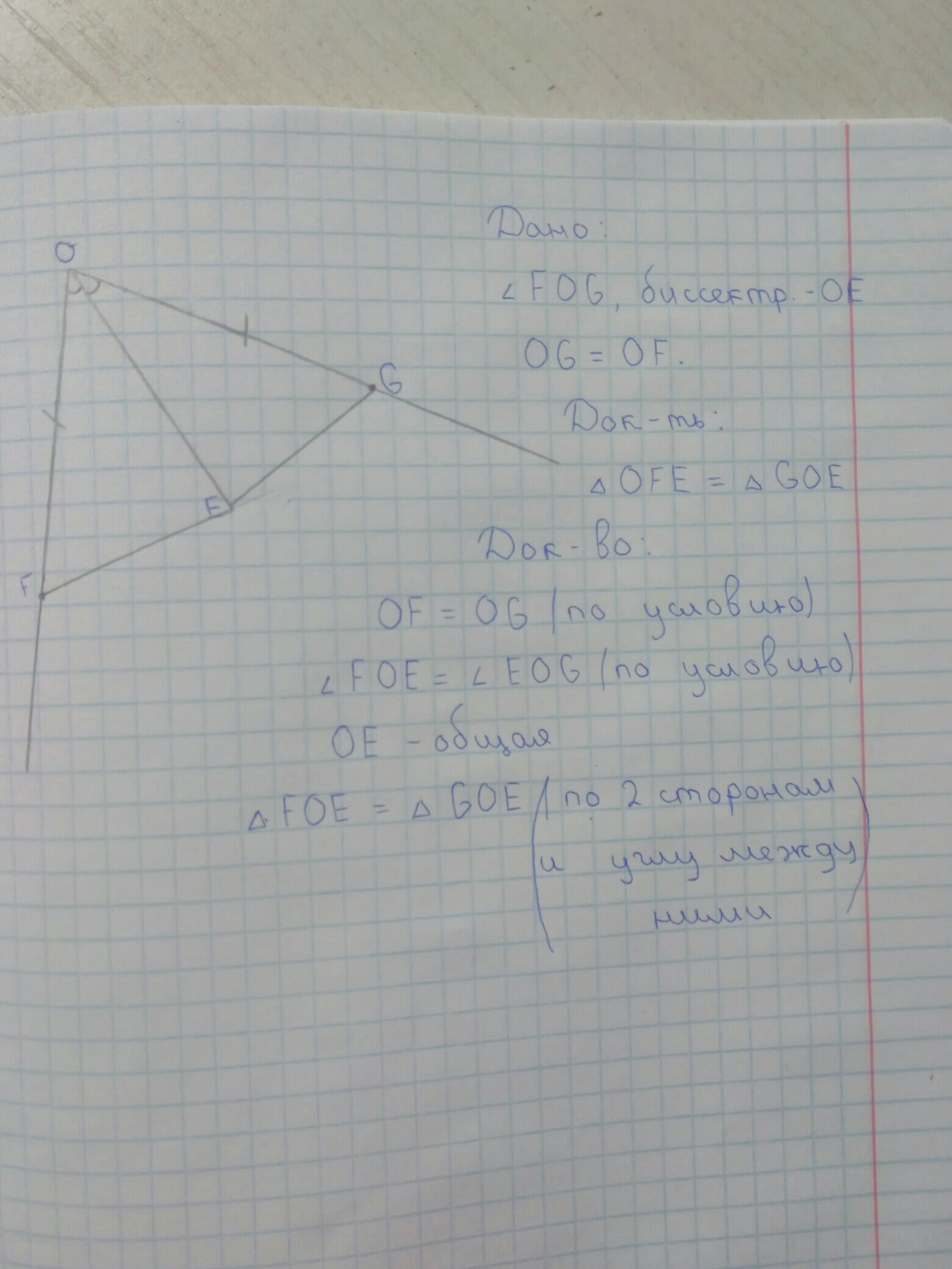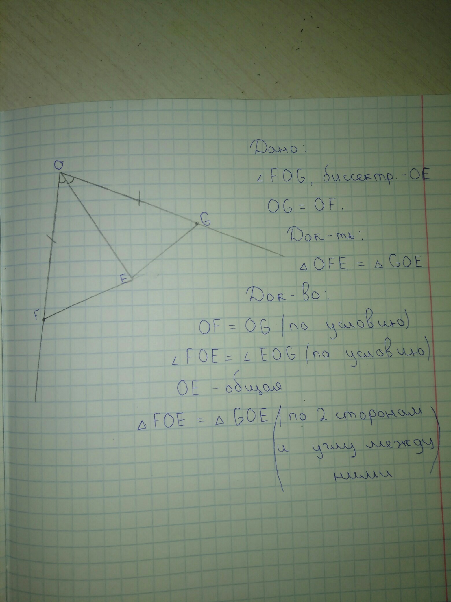 Луч OE - биссектриса угла FOG. На сторонах угла отложены равные отрезки OF и OG. Запишите равные элементы треугольников FOE и GOE и определите, по какому признаку треугольники равны. Нарисуйте.