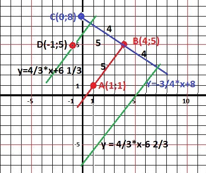 Точка D(-1,5), наклон k = 4/3 = 1,33