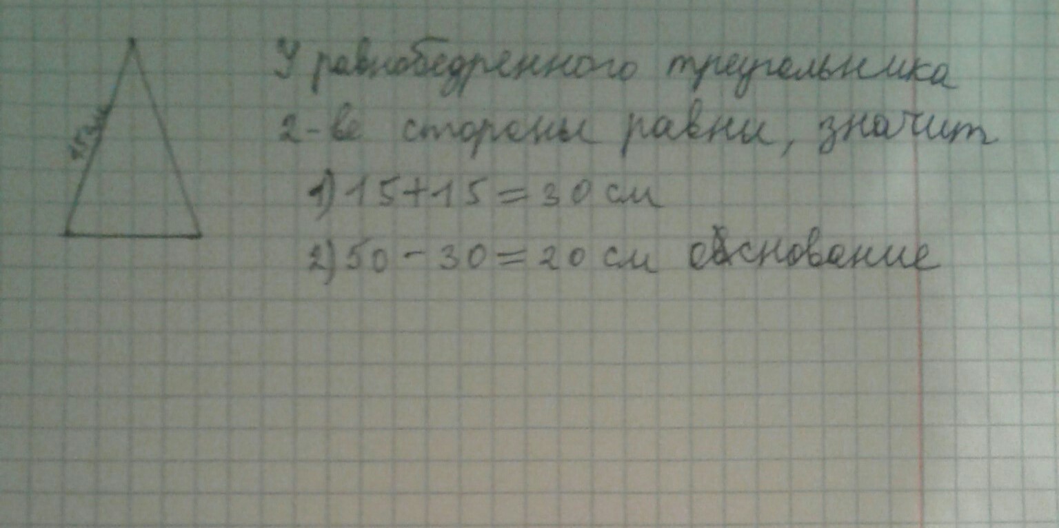 Боковая сторона равнобедренного треугольника равна 15 см, а периметр - 50 см. Какова длина его основания?