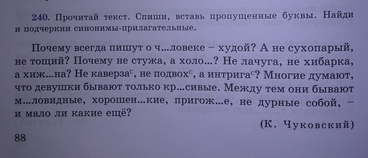 Почему всегда пишут о человеке-худой?А не сухопарый,не тощий.(прилагательные-синонимы:худой,сухопарый,тощий).Почему не стужа,а холод?(прилагательные-синонимы:стужа,холод)Не лачуга,не хибарка,а хижина?(прилагательные-синонимы:лачуга,хибарка,хижина)Не каверза,не подвох,а интрига?(прилагательные-синонимы:каверза,подвох, интрига)Многие думают,что девушки бывают только красивые.Между тем они бывают миловидные,хорошенькие,пригожие,не дурные собой,- и мало ли какие ещё?(прилагательные-синонимы:красивые,миловидные, хорошенькие, пригожие, не дурные собой)