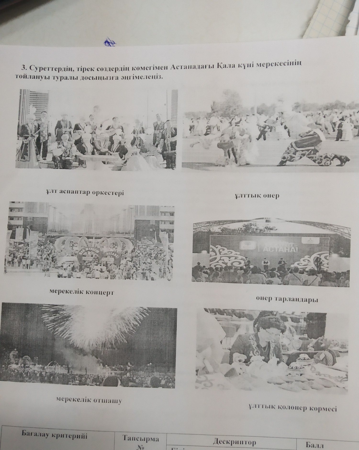 суреттердің тірек сөздердің көмегімен Астанадағы Қала күні мерекесінің тойлануы туралы досыңызға әңгімелеңіз