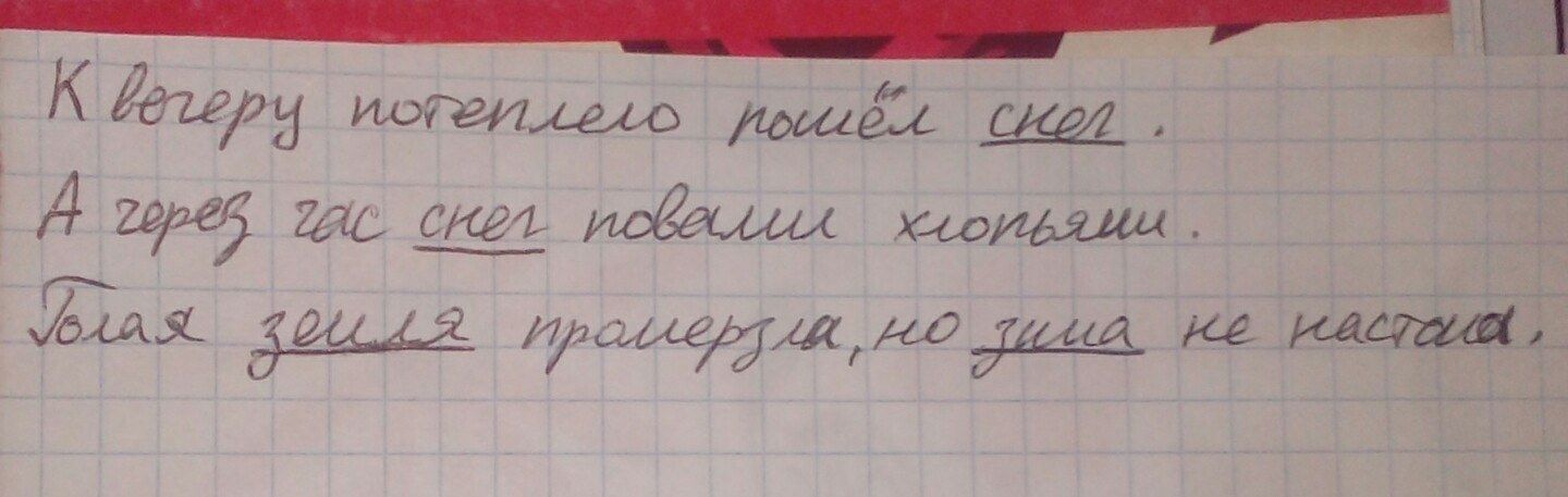К вечеру потеплело.Пошел снег.А через час снег повалил хлопьями.Голая земля промерзла,но зима не настала.