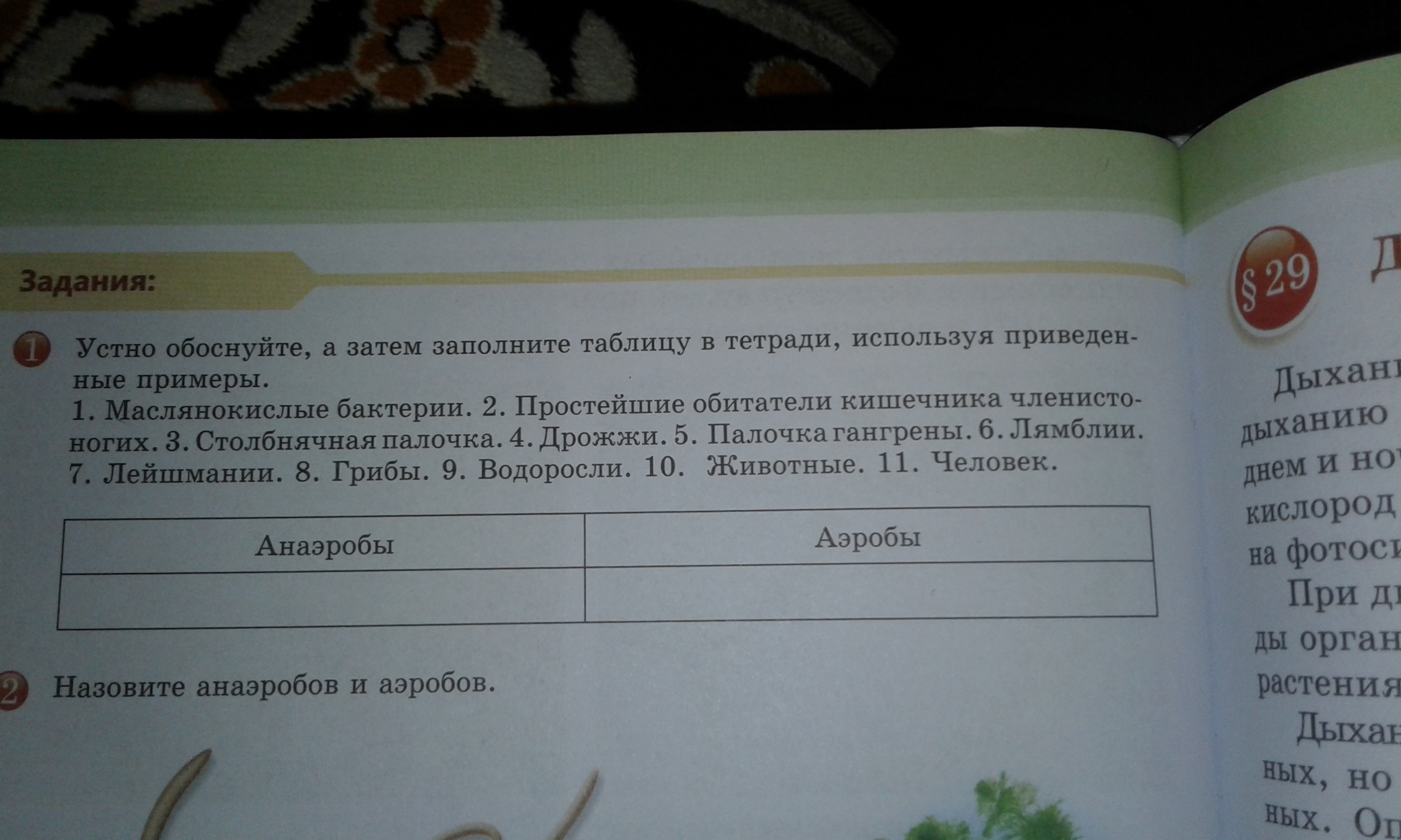 Анаэробы: маслянокислые бактерии, столбнячная палочка, дрожжи, палочка гангрены, лямблии, простейшие обитатели кишечника членистоногих, лейшмании.