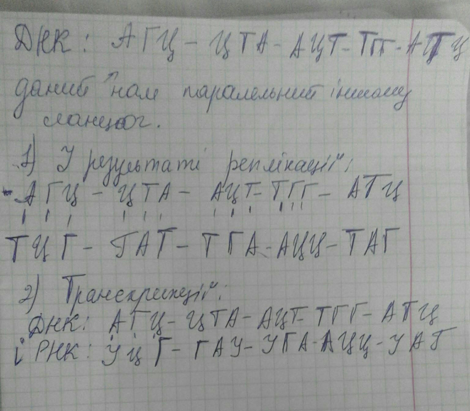 Послідовність нуклеотидів на одному з двох паралельних ланцюгів ДНК наступна:АГЦ-ЦТА-АЦТ-ТГГ-АТЦ.Запішить послідовність нуклеотидів,яка складається на ньому1)у результаті реплікації2)у результаті транскрипції
