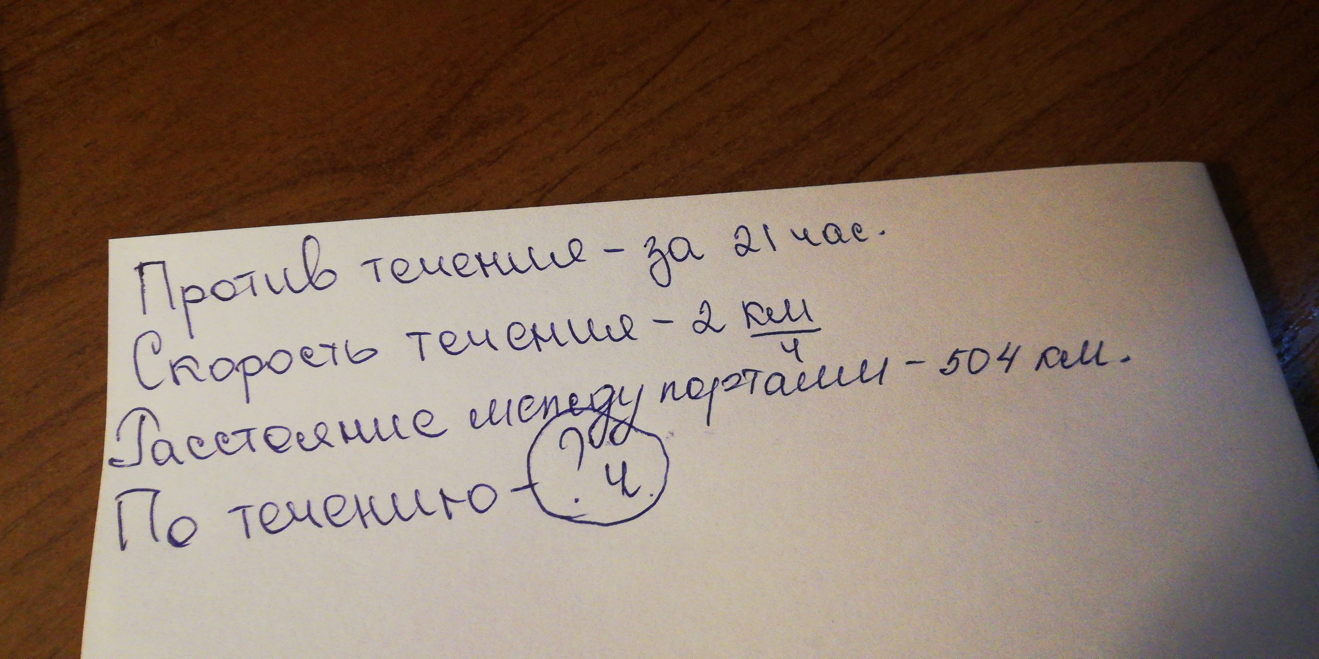 Расстояние между двумя портами равно 504 км. Двигаясь против течения реки, теплоход проходит это расстояние за 21 час. За сколько часов он пройдет это расстояние по течению реки, если скорость течения равна 2 км/ч ?