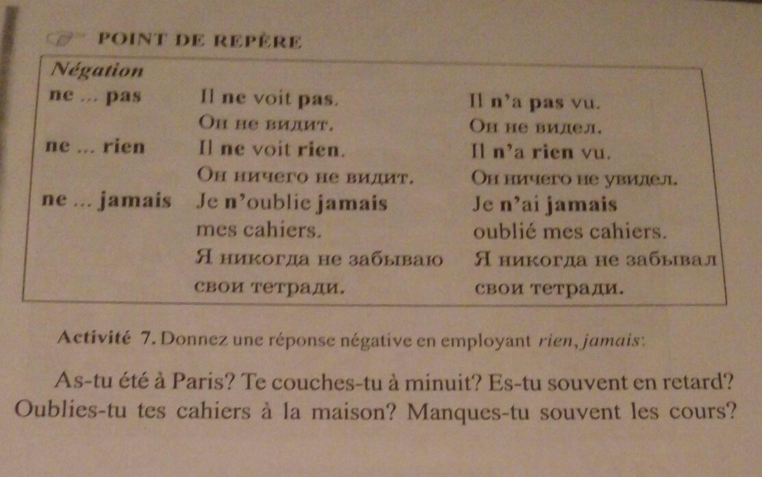 1. Je n'ai jamais été à Paris. 2. Je ne me couche jamais à minuit. 3. Je ne suis jamais en retard. 4. Je n'oublie jamais mes cahiers à la maison./ Je n'oublie rien à la maison. / Je n'oublie jamais rien. 5. Je ne manque jamais les cours./ Je ne manque rien.