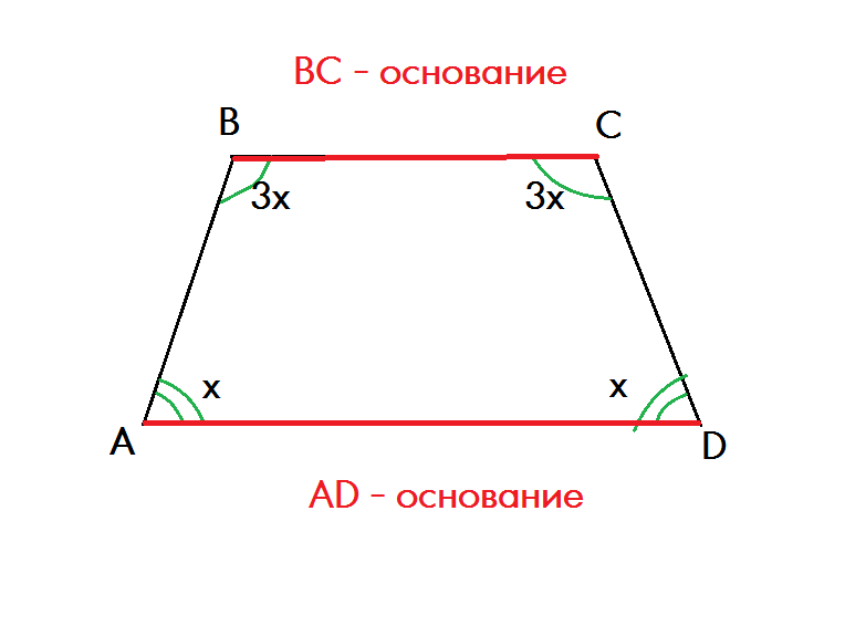 В равнобедренной трапеции углы при основании равны, то есть угол В = углу С, угол А = углу D. Следовательно: угол С = 3х, угол D = х.