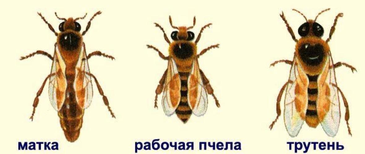Матка, рабочие пчелы и трутни различаются по внешнему строению (смотрите картинку во вложении).