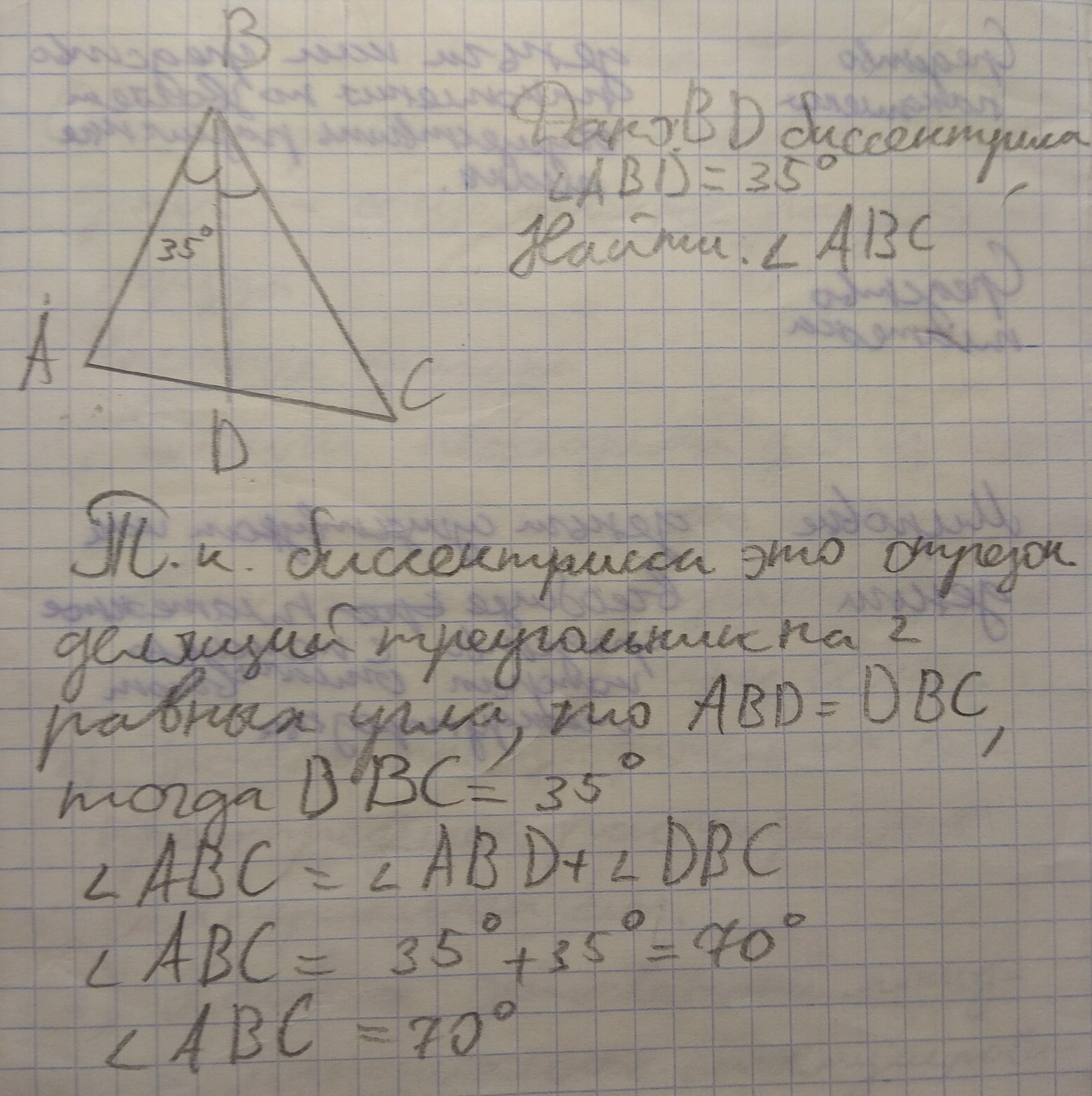 треугольнике ABC с основанием AC проведена биссектриса BD. Найдите угол ABC, если ABD=35.