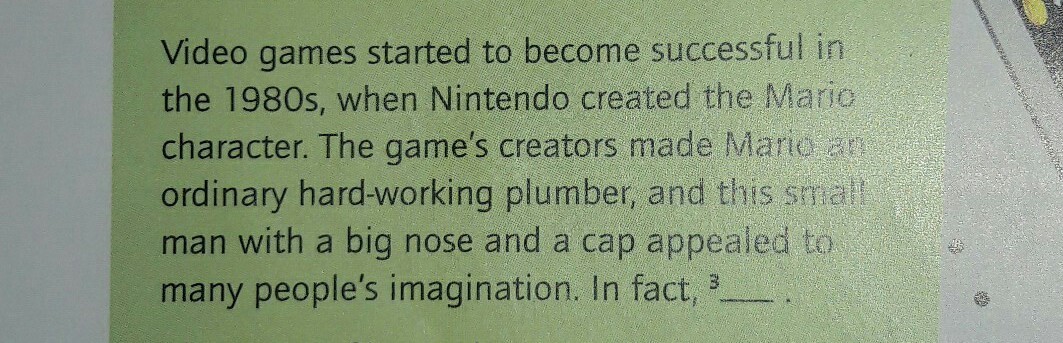 Видеоигры начали производиться успешно в 1980 году, когда Нинтендо создал персонажа Марио. Создатель игры сделал Марио обычным трудолюбивым сантехником и этот маленький человечек с большим носом и кепкой обратился многим людям воображением. Факт 3 _____ .