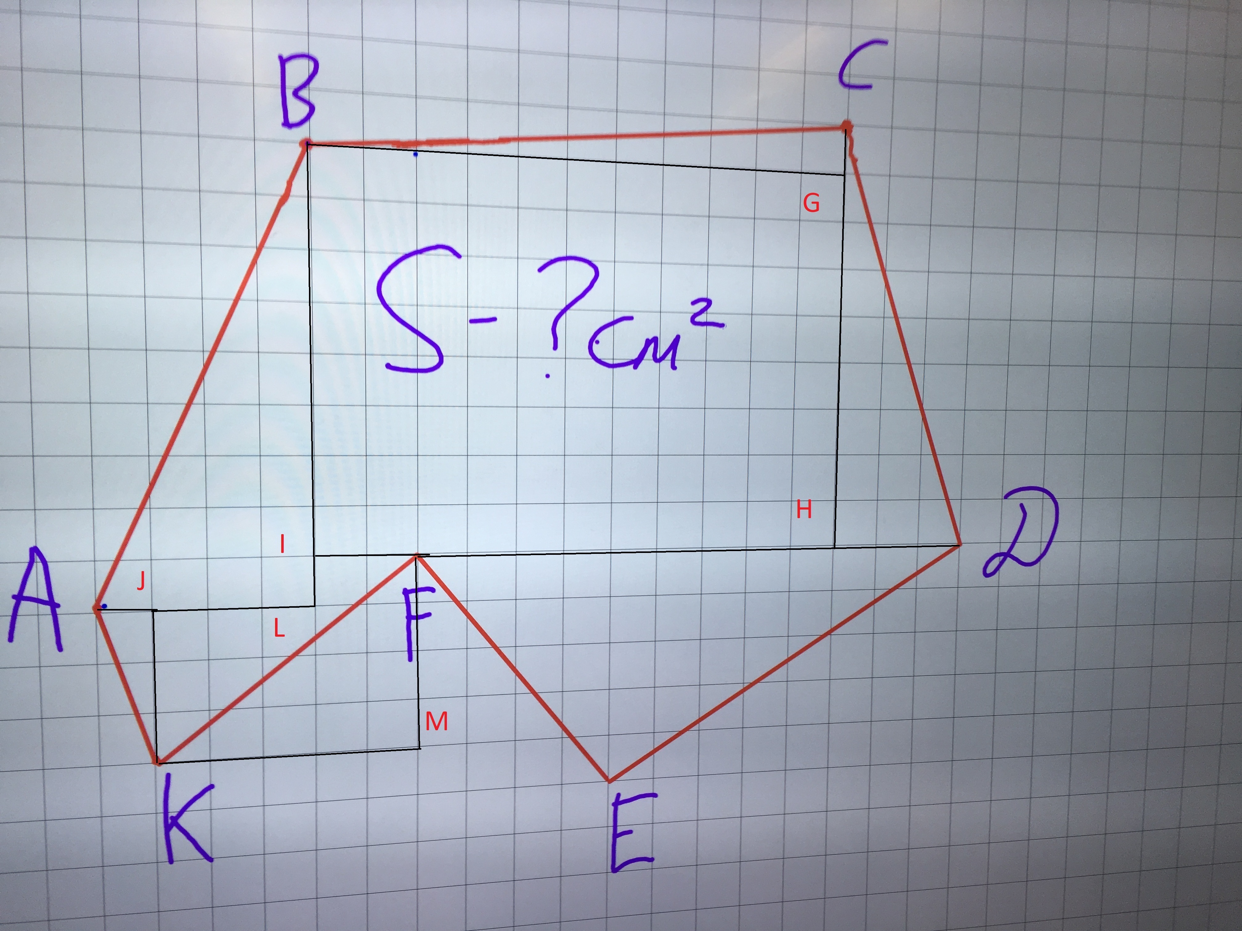 Площади прямоугольных треугольников находили по формуле полупроизведения катетов, площадь ΔEFD по формуле половины произведения основания на высоту, а площадь пятиугольника KJILF как разность площади шестиугольника KJILFM (которую можно посчитать например по клеточкам) и треугольника KFM