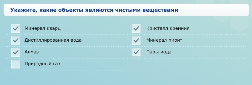 Минерал кварц, дистиллированная вода, природный газ, минерал пирит надеюсь правильно
