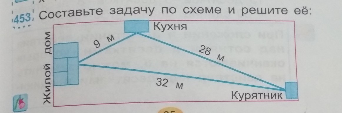 Расстояние от жилого дома до кухни составляет 9 метров, от Жилого дома до курятника 32 метра, а от кухни до курятника 28 метров. Вопрос сколько всего Женя пройдет метров если из дома он пойдёт на кухню возьмет крупу для кур, сходит и накормит их и вернется домой?