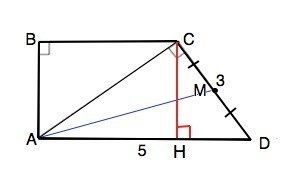 В трапеции, ABCD, угол, A, равен, 90, градусов, боковая, сторона, CD, перпендикулярна диагонали, AC. CD равен, 3 см, AD равен, 5, см, 1)НАйти, площадь, трапеции, 2) Найти, площадь, треугольника, AMD, если, M, середина, CD