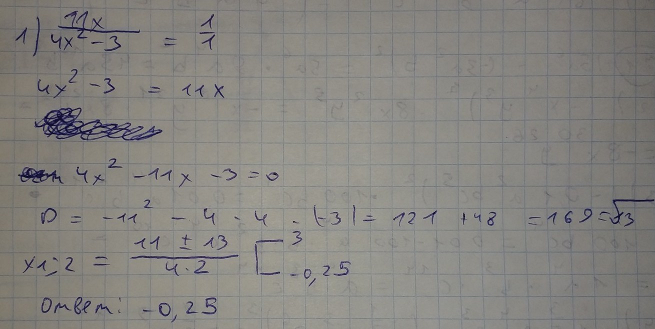 найти корень уравнения 11x/4x^2-3=1. если уравнение имеет более одного корня в ответ записать меньший из них