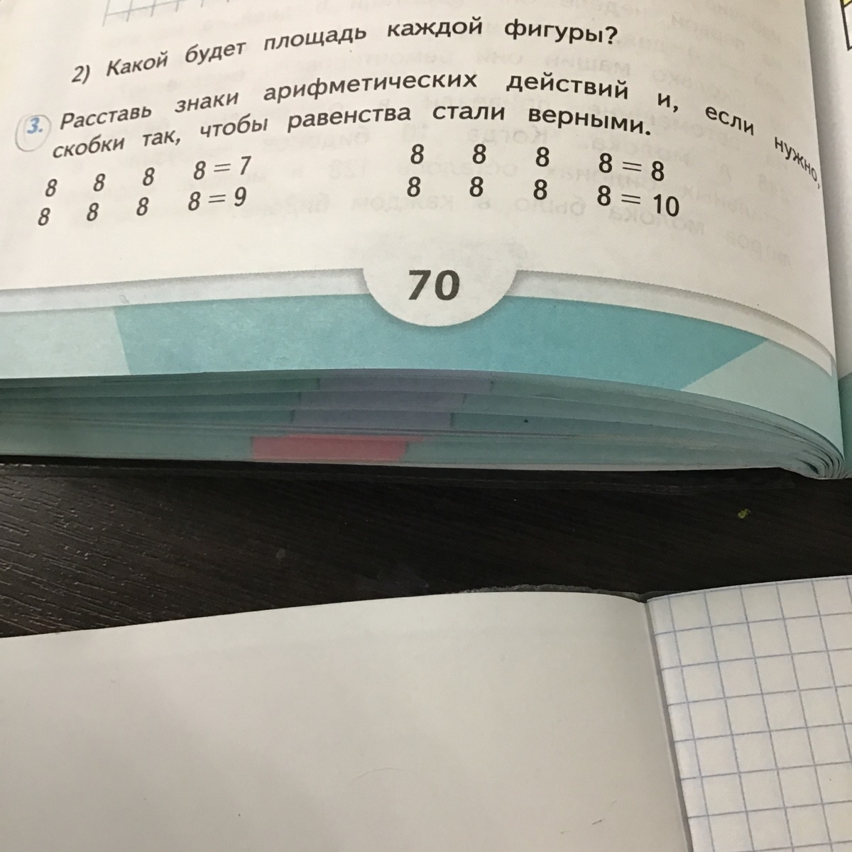 Расставь знаки арифмитечиских действий и если нужно скобки так чтобы равенства стали верными, 8 8 8 8 = 7, 8 8 8 8 =9, 8 8 8 8 = 8, 8 8 8 8 = 10