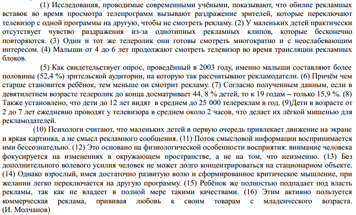 современный мир полон конкуренции. и реклама становится основной успеха. существует несколько видов рекламы, и одной из самых популярных на сегодняшний день это телевизионная реклама. автор в своей статье затрагивает проблему навязывания рекламодателем своего товара зрителю, и данная статья актуально тем, что сегодня много сторонников желающих отменить рекламу. ка подчеркнул автор в своей статье в частности реклама раздражает зрителя, что толкает его на то, чтобы переключить программу на другой канал. и с этой точки зрения можно говорить и о рейтинге каналов,если бы не было рекламы, может зритель продолжал бы смотреть один и тот же канал на протяжении нескольких часов не переключая? однако, у этой проблемы как и у медали две стороны. часть зрителей, смотря любимую программу ждут рекламу, чтобы отойти по своим делам. и тут реклама играет выигрышную роль.