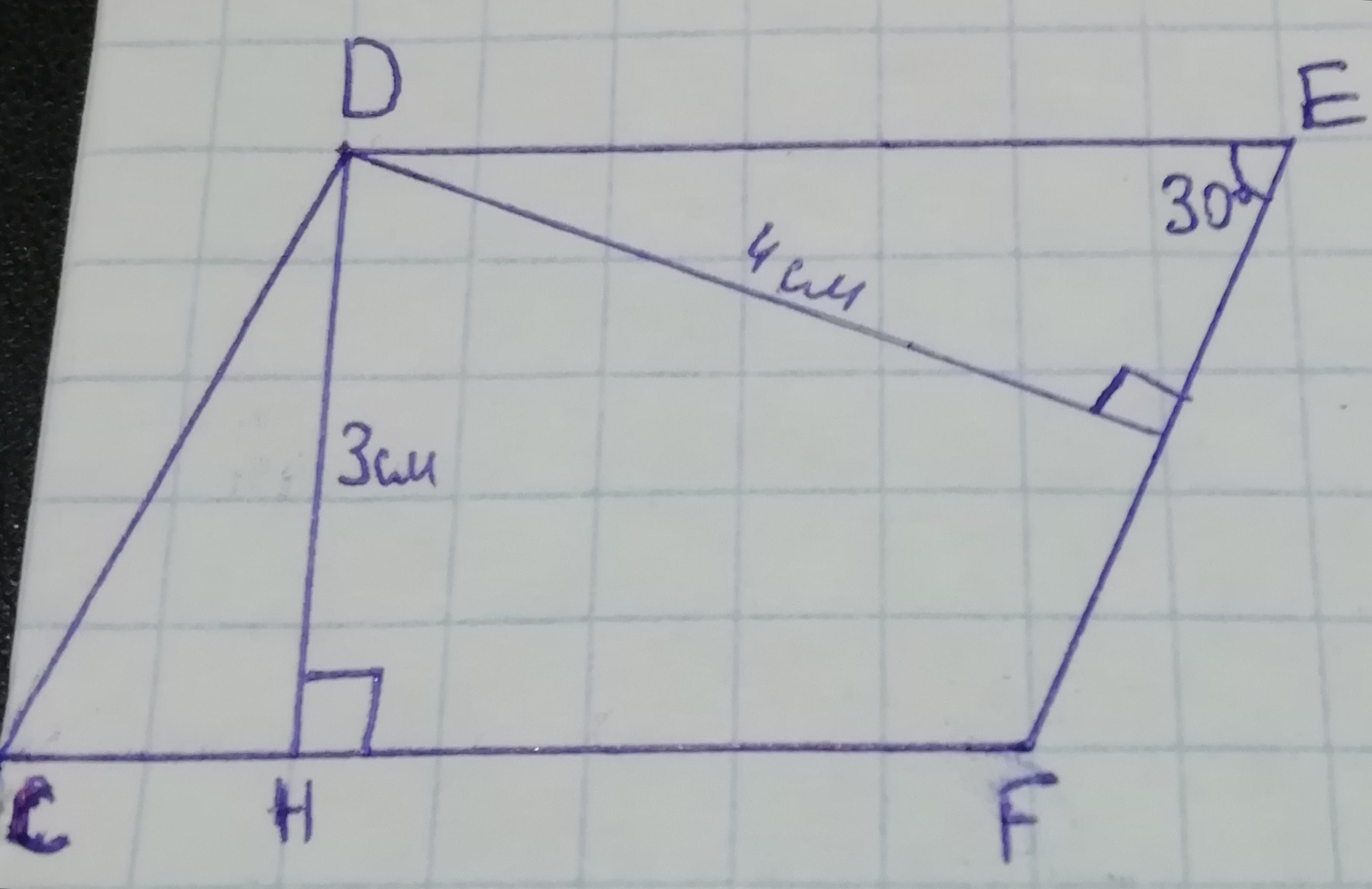 Высота h=4см лежит напротив угла 30°, из этого следует, что гипотенуза DE в 2 раза длиннее.