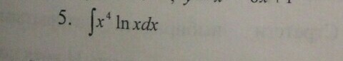 int x^4cdot lnx, dx=[; u=lnx,; du=frac{dx}{x},; dv=x^4, dx,; v=frac{x^5}{5}; ]=\\=uv-int v, du=frac{x^5}{5}cdot lnx-frac{1}{5}int frac{x^5, dx}{x}=frac{x^5}{5}cdot lnx- frac{1}{5}cdot int x^4, dx=\\=frac{x^5}{5}cdot lnx-frac{1}{5}cdot frac{x^5}{5}+C=frac{x^5}{5}cdot (lnx-frac{1}{5})+C