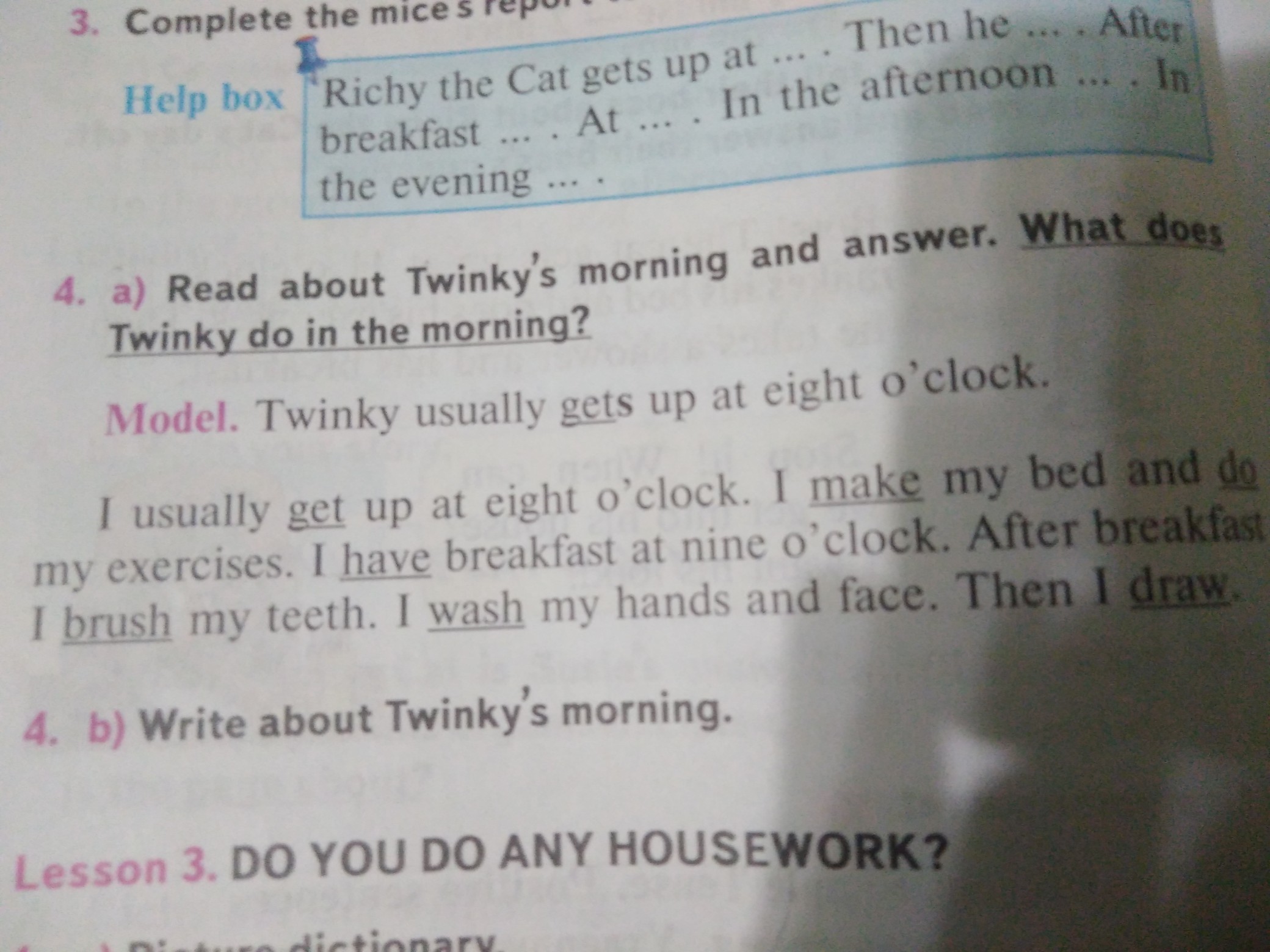 Twinkly usually gets up at eight o'clock. He makes his bed and does his exercises. He had breakfast at nine o'clock. After breakfast he brashes his teeth. He washes his hands and face. Then he draws.