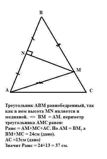 В треугольнике ABC сторона BC равна 24 см. Точка N - середина стороны AB. Через нее перпендикулярно стороне AB провели прямую, пересекающую сторону BC в точке M. Найдите периметр (в см) треугольника AMC, если сторона. AC равна 13 см.