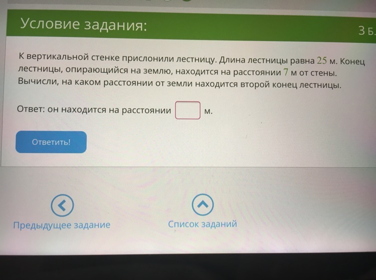 Получается треугольник, гипотенуза (Г) которого равна 25 м, а один из катетов (К1) - 7 м.