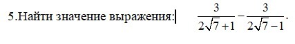 frac{3}{2sqrt{7}+1 }-frac{3}{2sqrt{7}-1 }=frac{6sqrt{7}-3-6sqrt{7}-3}{(2sqrt{7}-1)(2sqrt{7} +1) }=frac{-6}{(2sqrt{7})^{2}-1^{2}}=-frac{6}{28-1}=frac{6}{27} =frac{2}{9}