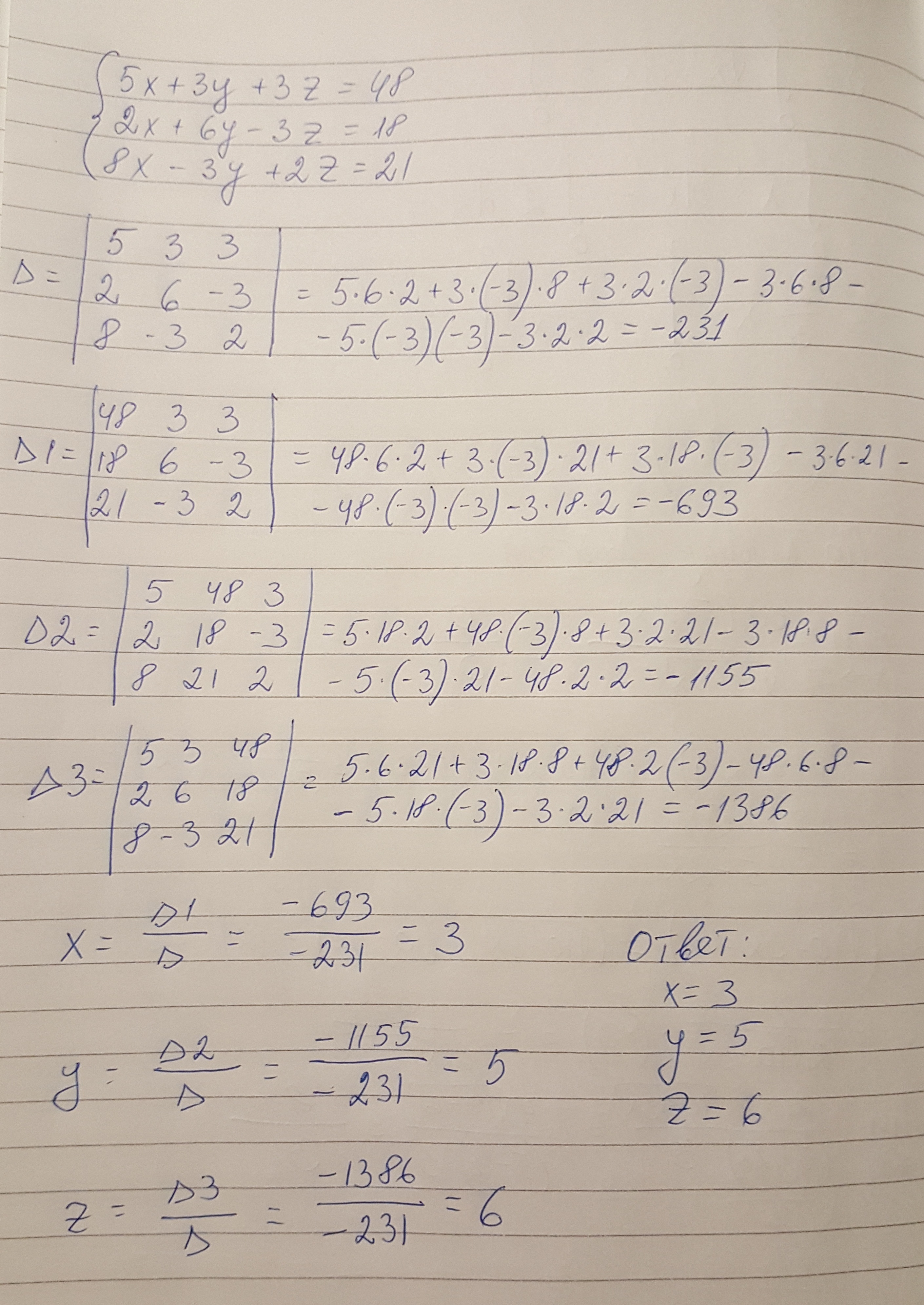Народ пожалуйста помогите решить уравнение завтра уже задавать Решите систему уравнений: 5x+3y+3z=48, 2x+6y-3z=18, 8x-3y+2z=21.