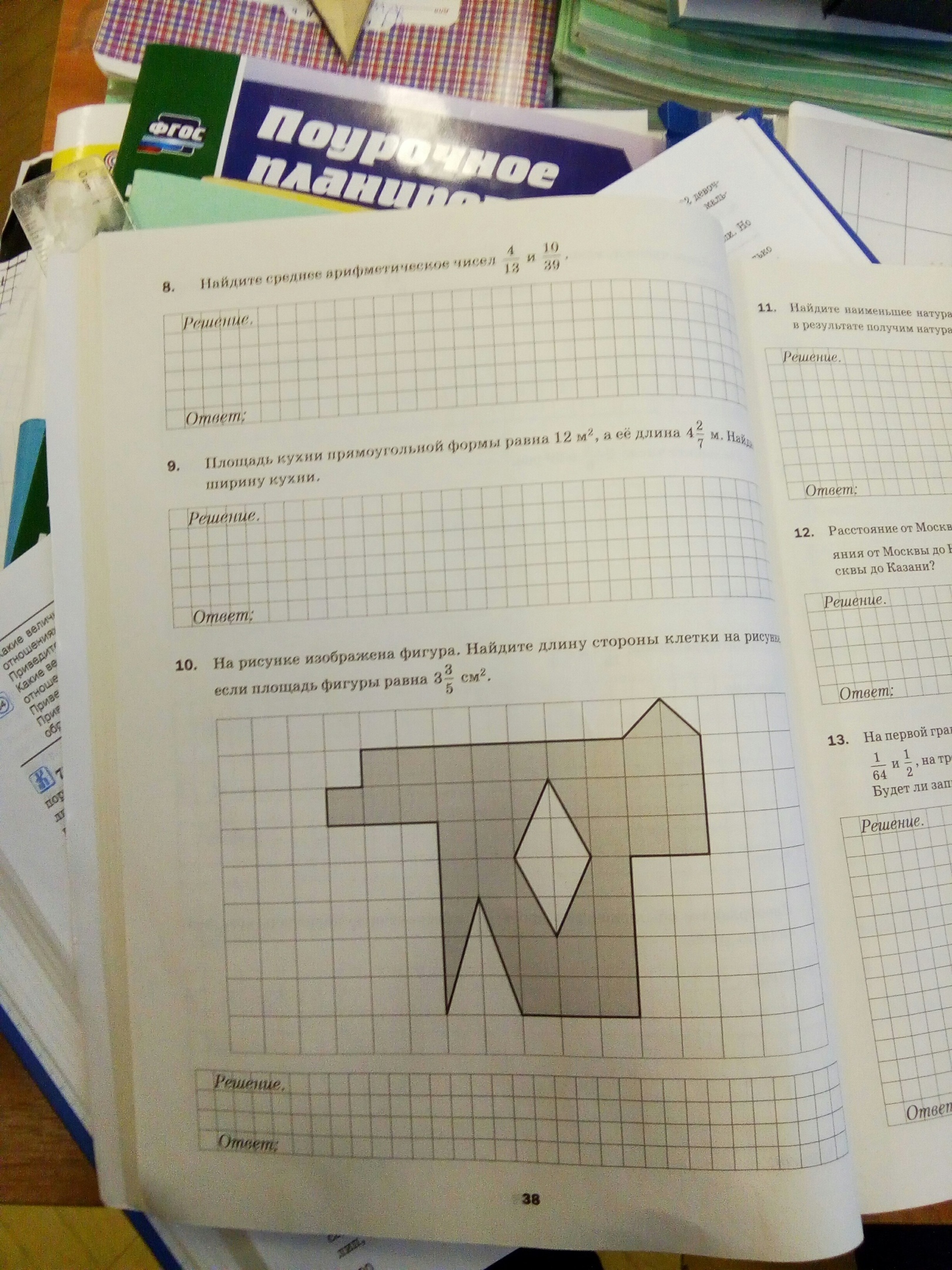 10. Пусть х см длина стороны клетки. Возьмем большой прямоугольник 9х*7х=63х², прибавим выступы и вычтем вырезы: (63+1+1-10-3-4-8)х²=40х²=18/5см²