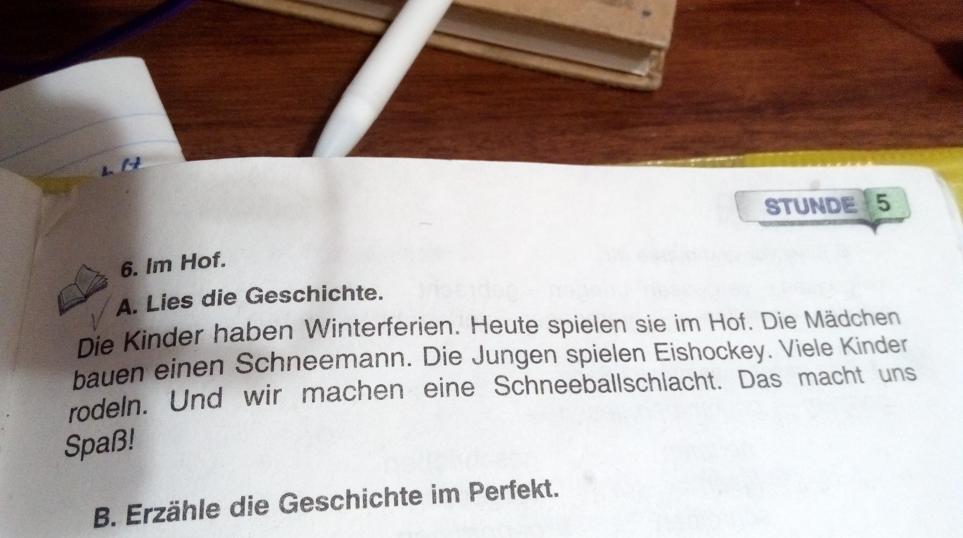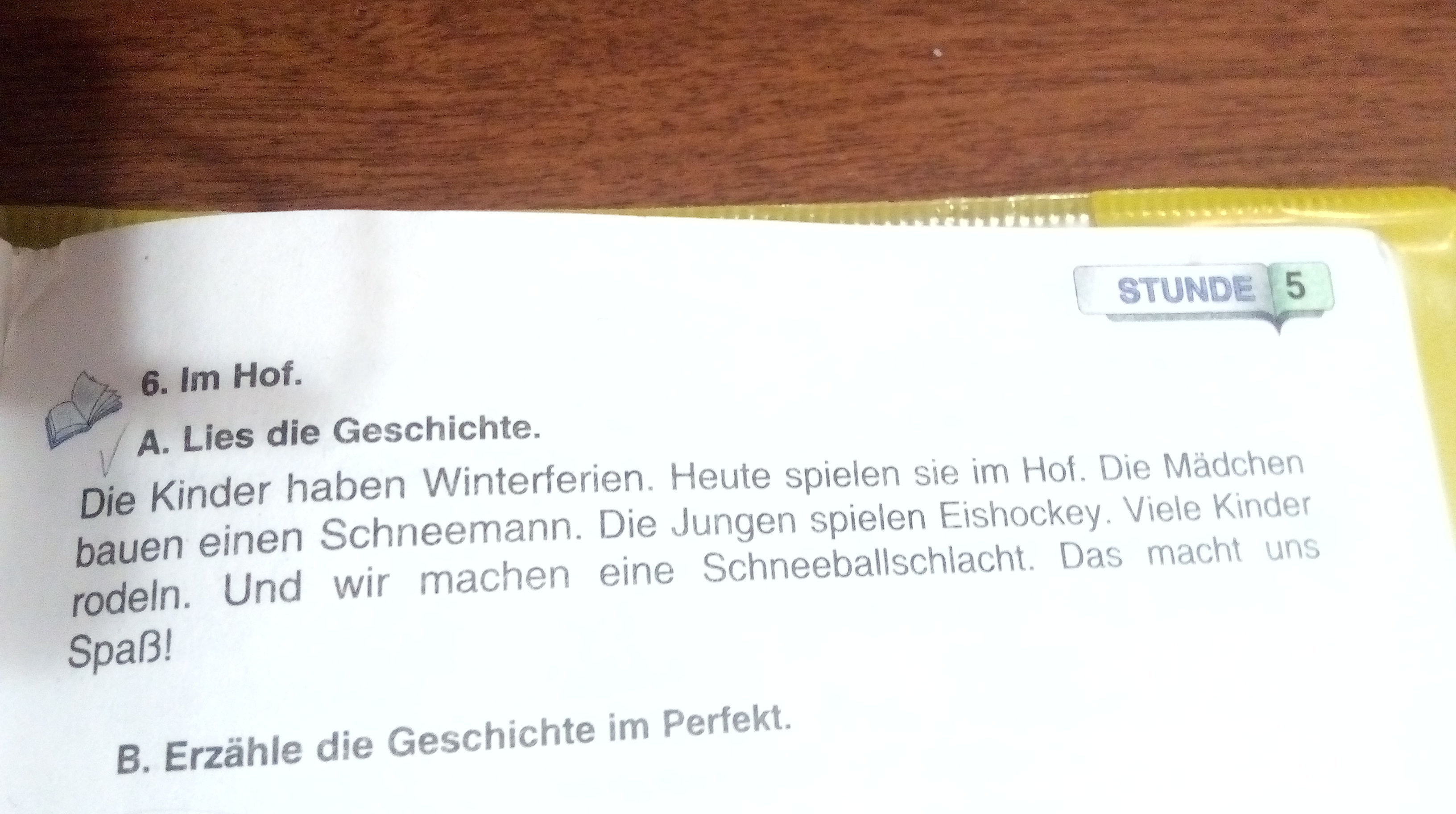 Die Kinder haben Winterferien gehabt. (Heute) Am Tag haben sie im Hof gespielt. Die Mädchen haben einen Schneemann gebaut. Die Jungen haben Eishockey gespielt. Die Kinder sind gerodelt. Und wir haben eine Schneeballschlacht gemacht. Das hat uns Spaß gemacht. (Perfekt)