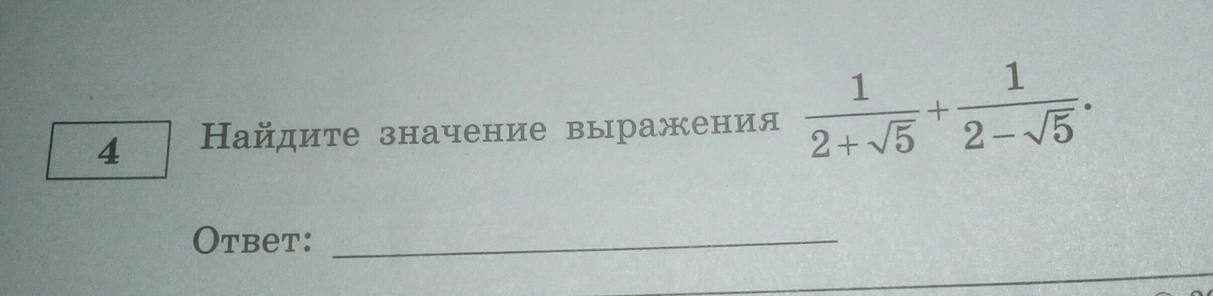 frac{1}{2 +  sqrt{5} }  +  frac{1}{2 -  sqrt{5} }  =  frac{2 -  sqrt{5} + 2 +  sqrt{5}  }{ { 4 - sqrt{5} }^{2} }   =  frac{4}{4 - 5}  =  frac{4}{ - 1}  =  - 4