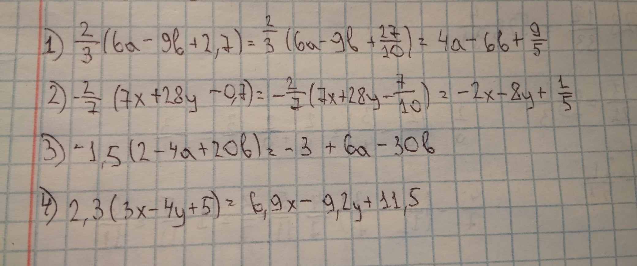 Раскройте скобки в алгебраических выражениях: 1) 2/3 (6а - 9b + 2,7) ; 2) -2/7 ( 7х + 28у - 0,7) ; 3) -1,5 ( 2 - 4а + 20b) ; 4) 2,3 ( 3х - 4у + 5). Пж надо срочно!!