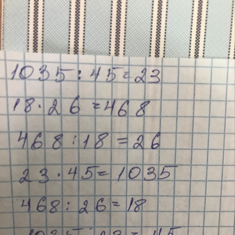Используя данное равенство ,найдите значение двух следующих выражений 18*26=468, 1035:45=23, 468:18= , 23*45= , 468:26= , 1035:23