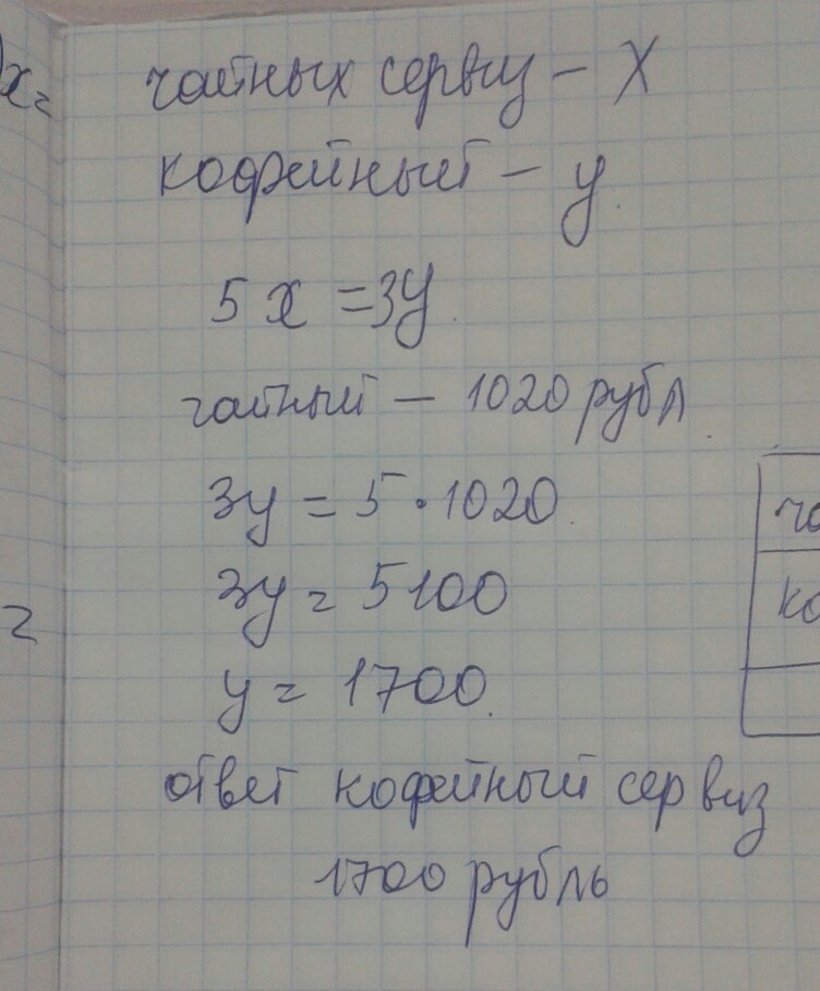 Пять чайных сервизов стоят столько же, сколько три кофейных.Сколько стоит кофейный сервиз,если цена чайного 1020 рублей?решите плиз с таблицей можите фоткой в тетради дам 20 балов помогите!!!!!