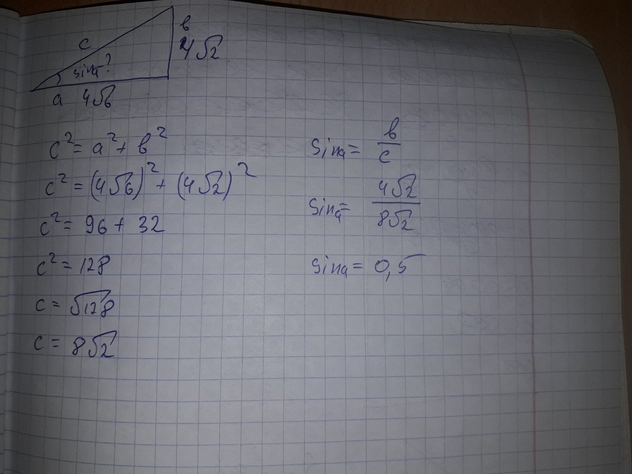 катеты прямоугольного треугольника равны 4корень из шести и двух найдите синус наименьшего угла этого треугольника