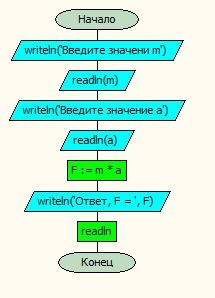 разработать блок схему, составить программу, произвести отладку и тестирование: для вычисления силы F, которая действует на тело массой m, которое движется с ускорением a (формула F=ma)