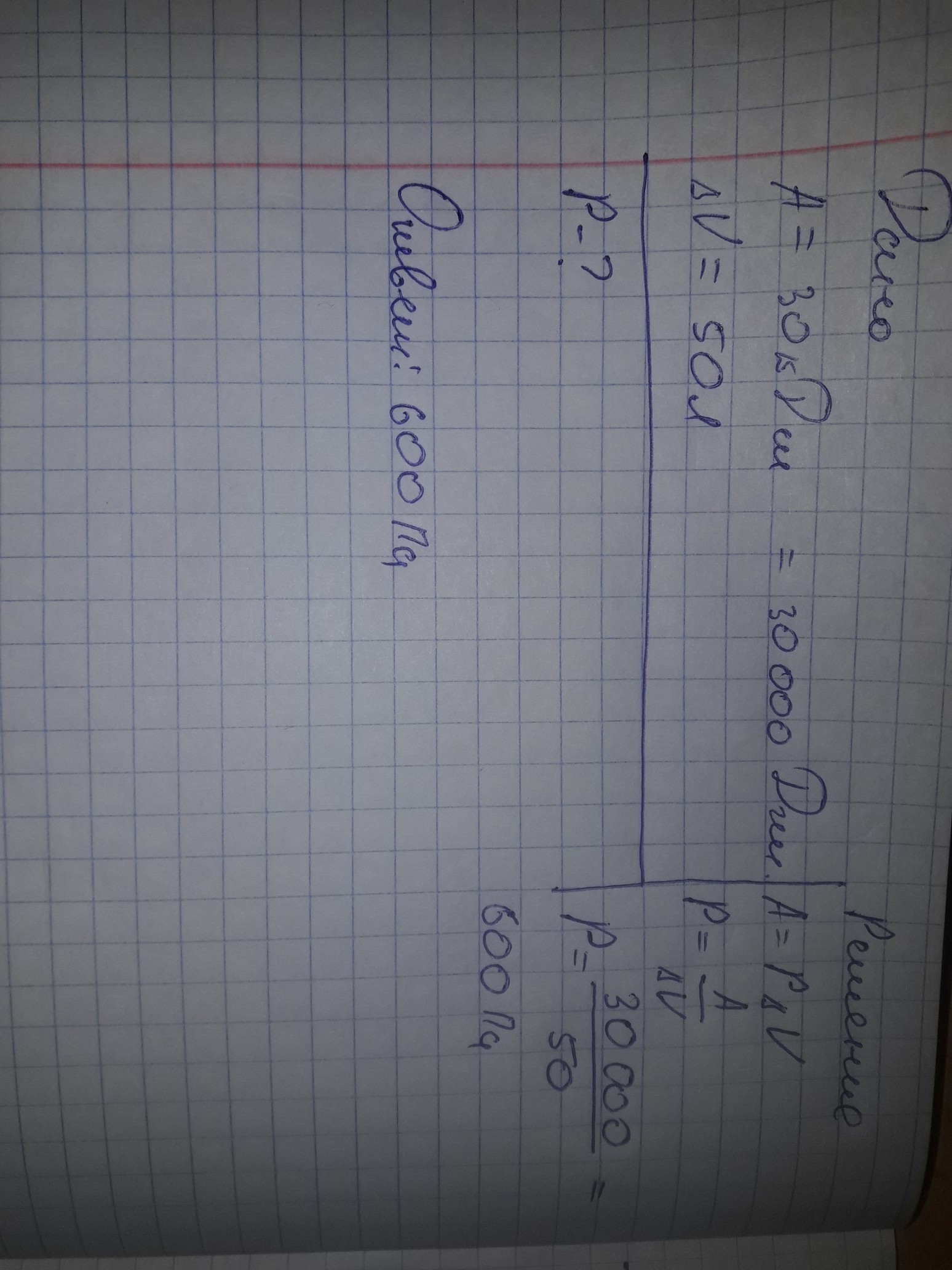 газ при изобарическом процессе совершил работу 30 кДж. Чему равно давление газа, если объем увеличился на 50л?