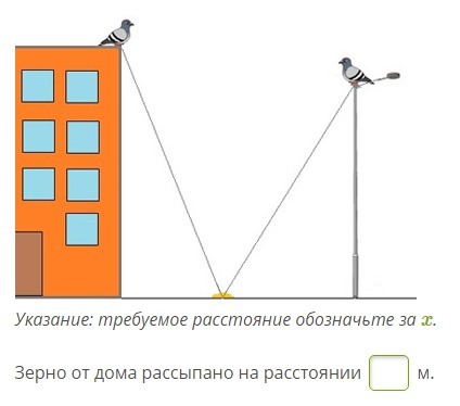 Вычислите, на каком расстоянии от дома Анна рассыпала зерно, если известно, что высота дома равна 4 м, высота фонаря 3 м. Фонарь находится от дома на расстоянии 7 м.