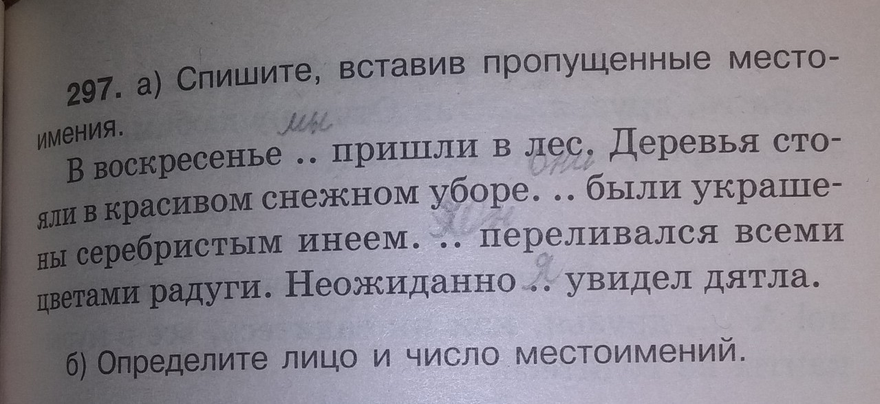 В воскресенье мы пришли в лес. Деревья стояли в красивом снежном уборе. Они были украшены серебристым инеем. Он переливался всеми цветами радуги. Неожиданно я увидел дятла