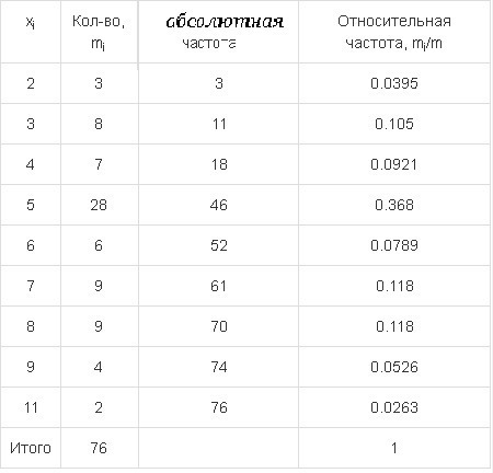 Находим xi, при котором абсолютная частота будет больше ∑m/2 = 39. Это значение xi = 5. Таким образом, медиана равна 5.