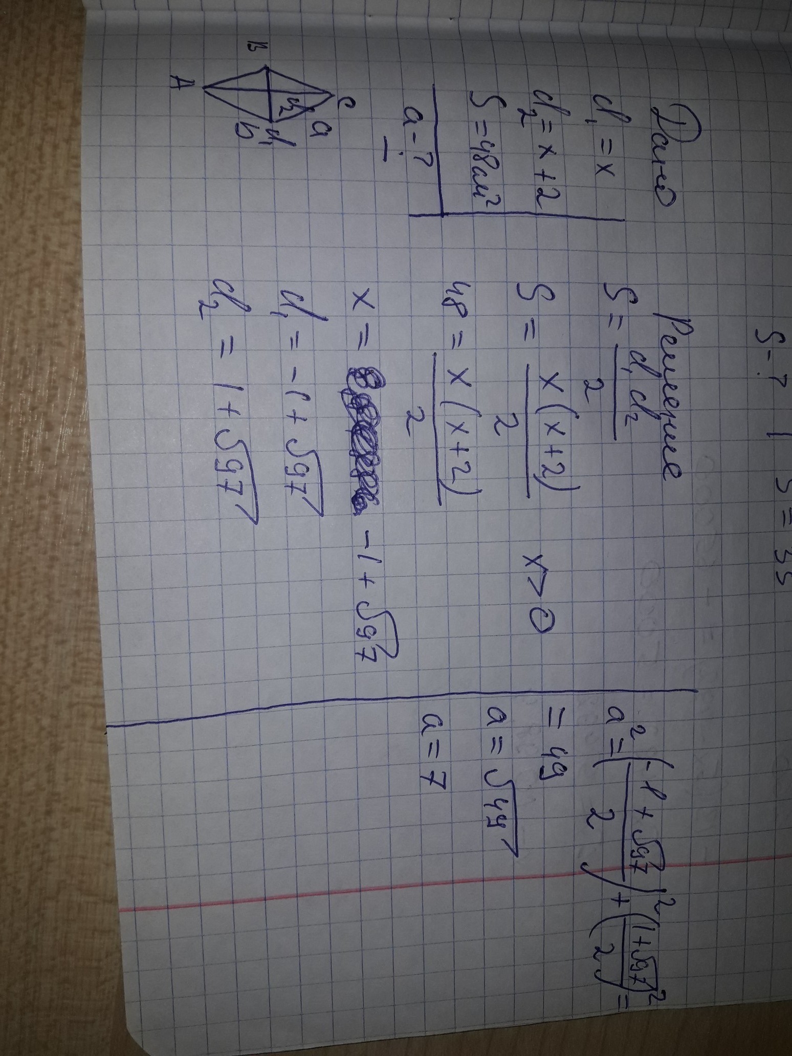 одна из диагоналей ромба на 2 см больше другой, а площадь ромба равна 48 см².Найдите сторону ромба ?