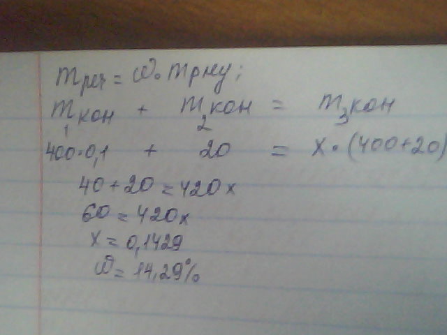 у 400 г розчину калій гідроксиду з масовою часткою 10% розчинили ще 20г калій гідроксиду. обчисліть масову частку лугу в новому розчині