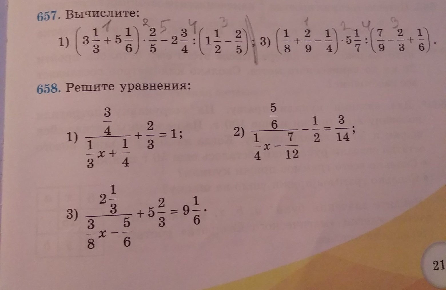 Вот моё решение на 657 номер. К сожалению, не могу вспомнить, как решаются уравнения с дробью в 4 строчки. Честно, я покапалась в старых тетрадках, а правило так и не нашла... Надеюсь ты сможешь разобрать мой почерк. Удачи