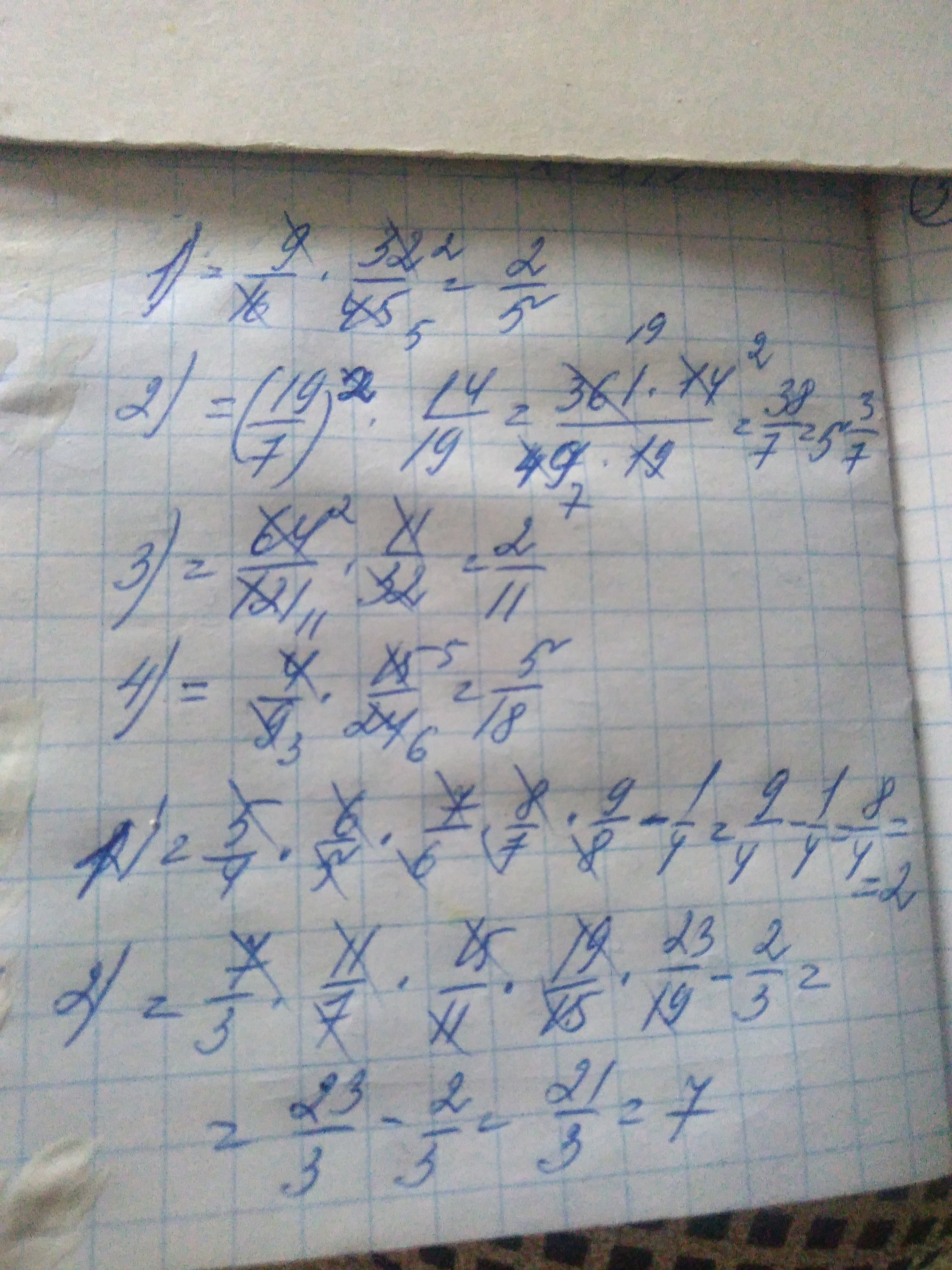1)(3/4)²*32/45 2) (2ц 5/7)² * 14/19 3) (8/11)² *11/32 4) (2/3)²*15/24