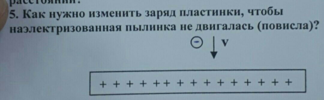 5. Как нужно изменить заряд пластинки, чтобы наэлектризованная пылинка не двигалась (повисла)? (на фото)