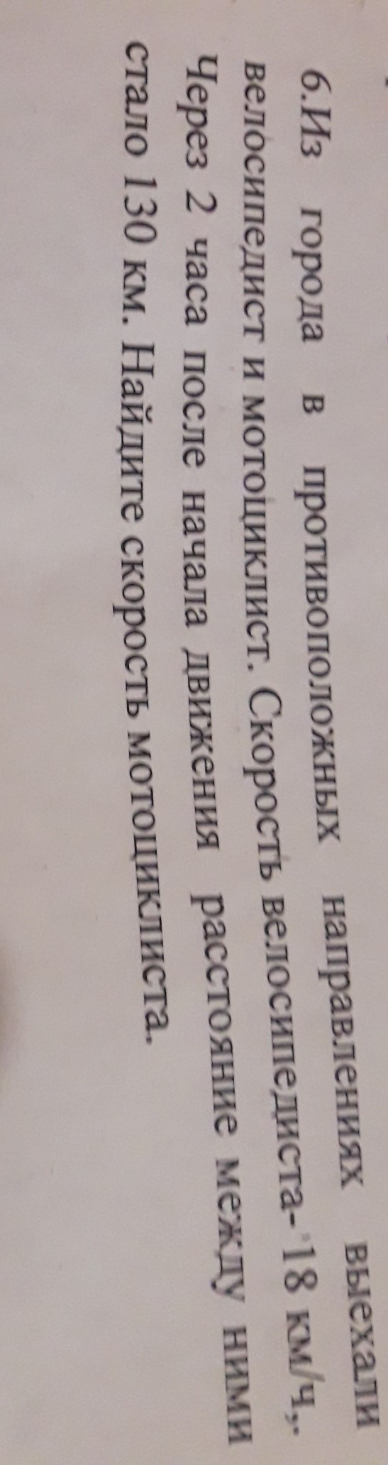 из города в противоположных направлениях выехали велосипедист и мотоциклист скорость велосипедиста 18 км ч через 2 часа после начала движения расстояние между ними стало 130 км Найдите скорость мотоциклиста